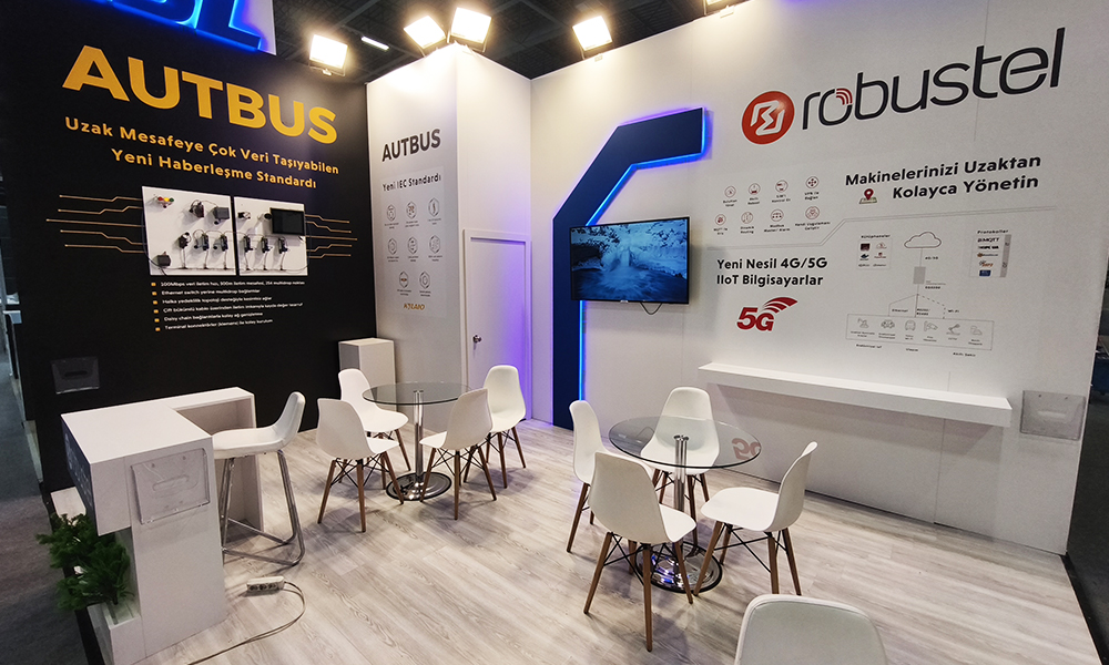 This design, which we made at the 2024 Industry 4.0 Istanbul IFM fairground, is a customizable disposable wooden custom-made exhibition stand. White and black chipboard were selected as the material for the stand construction and the signage selection was applied as hidden LED illuminated foam letter cutting.